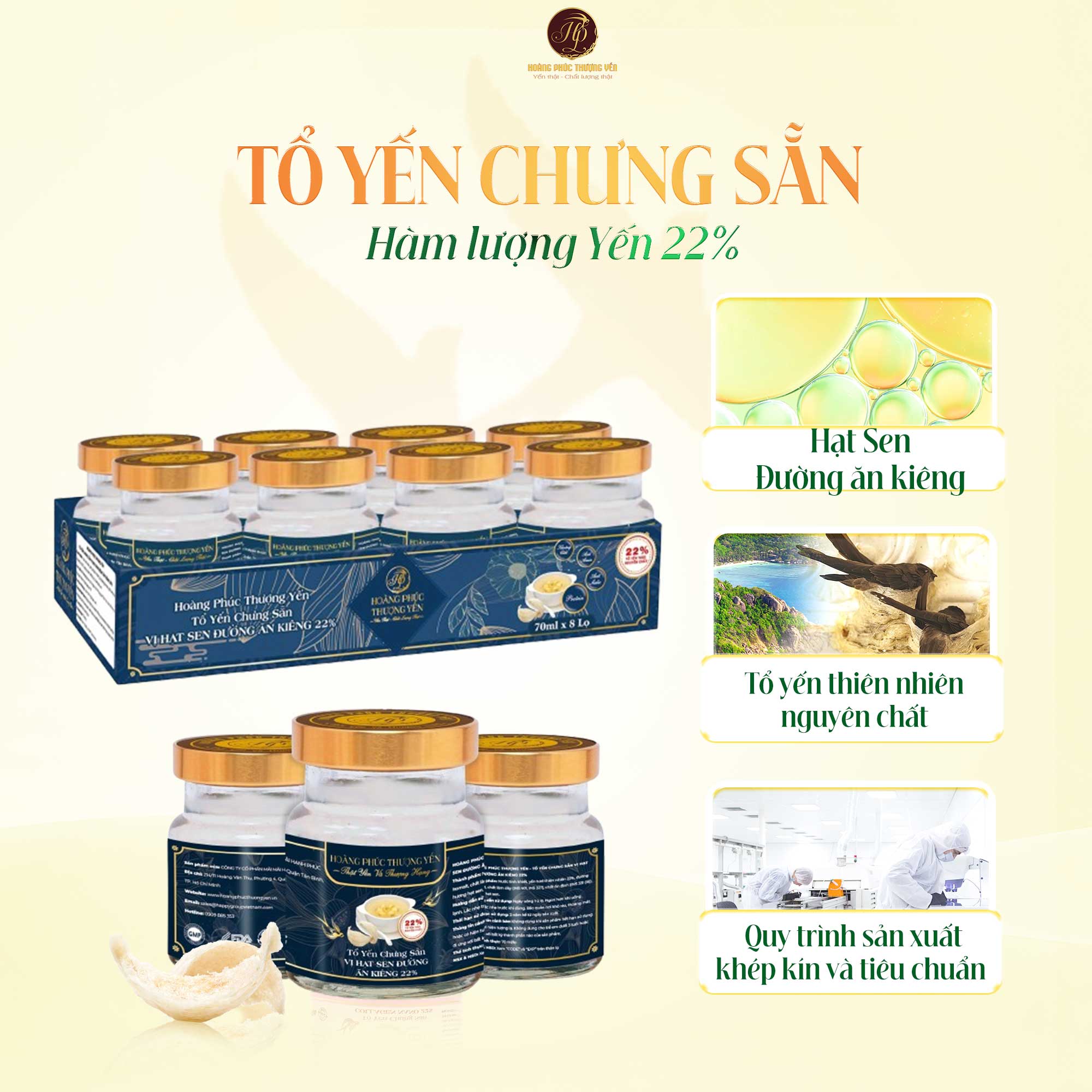 Tổ Yến Chưng Sẵn Hoàng Phúc Thượng Yến Vị Hạt Sen Đường Ăn Kiêng 22% là sản phẩm dinh dưỡng cao cấp, kết hợp giữa tổ yến tươi và hạt sen giàu dưỡng chất.
